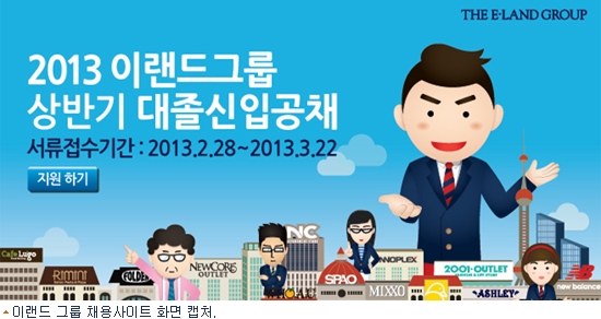 이랜드그룹은 지난 2월 28일부터 22일 오전 10시까지 그룹 채용사이트(www.elandscout.com)를 통해 원서접수 받기로 했던 상반기 대졸 공개채용 온라인 서류 접수를 25일 오전 9시까지 연장한다고 밝혔다.