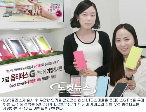 LG유플러스(부회장 이상철)는 최신 LTE 스마트폰 옵티머스G Pro를 구매하는 고객 중 선착순 5만명을 대상으로 다양한 색상의 퀵 커버 케이스와 신형 무선 충전패드를 제공하는 일석이조 이벤트를 진행한다고 23일 밝혔다.