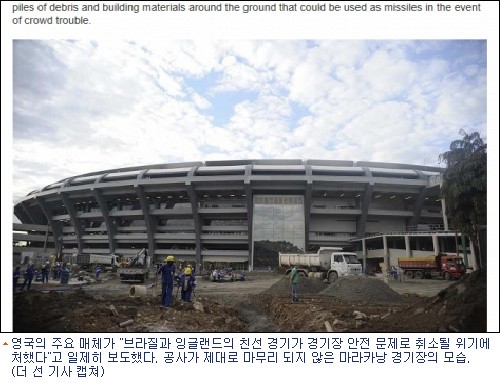 31일 ''''더 선'''', ''''BBC''''등 영국의 주요 매체는 ''''브라질과 잉글랜드 간의 친선전이 경기장 안전 문제로 연기됐다''''고 보도했다. 해당 지역 법원은 ''''경기장 시설이 완벽하지 않아 관중들에게 위험을 끼칠 수 있다''''며 친선전을 연기할 것을 명령했다.