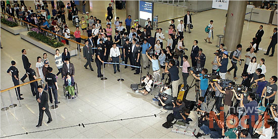 미국 샌프란시스코 국제공항에서 착륙하다 활주로에 충돌한 아시아나항공 214편 B777-200 여객기 승무원 6명이 11일 오후 인천국제공항을 통해 입국하고 있다. 이날 입국한 승무원은 선임승무원 이윤혜씨를 비롯해 남성 승무원 유태식씨, 여성 승무원인 이진희, 김지연, 한우리, 김윤주씨 등 6명이다.