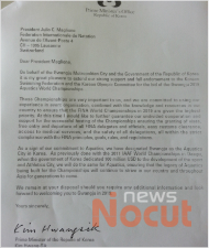 광주시 유치위원회가 김황식 총리의 서명을 위조해, 수영연맹에 제출한 정부 보증서.