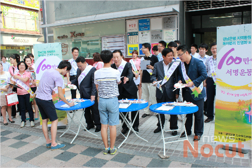 인수추진위원장들과 직원들은 무더위 속에서도 시민들을 직접 만나 경남은행 지역환원의 경과와 당위성을 설명하며 서명을 받았다.{RELNEWS:right}