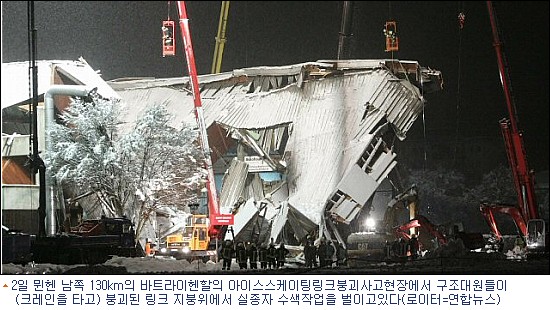 獨폭설로 눈무게 못견뎌 아이스링크 붕괴..50여명 매몰