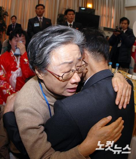 설 계기 이산가족상봉 행사 마지막 날인 22일 오전 금강산호텔에서 열린 작별상봉에서 최돈명(79) 할머니가 남동생 돈걸, 조카 옥실 씨와 이별을 아쉬워하고 있다.