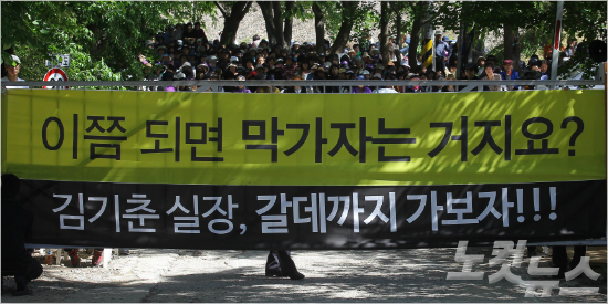 26일 경기도 안성시 금수원 정문에 '이쯤 되면 막가자는 거지요?'와 '김기춘 실장, 갈데까지 가보자!!!'라는 문구가 적힌 현수막이 걸려 있다. (박종민 기자/자료사진)