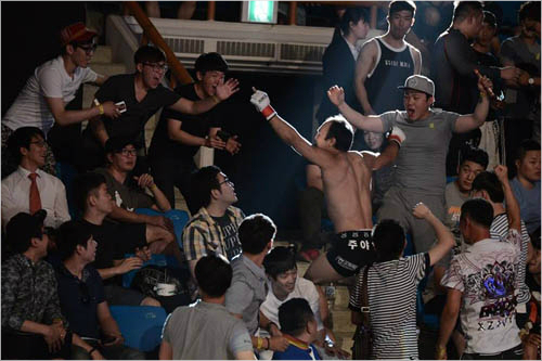 김수철(23, 팀포스)이 31일 강원도 원주 치악체육관에서 열린 '로드FC 15' 대회 밴텀급 매치에서 타무라 이세이(30, 일본)를 1라운드 2분 45초 만에 리어네이키드 초크로 꺾은 후 관중석으로 뛰어들어 승리의 기쁨을 만끽하고 있다.
