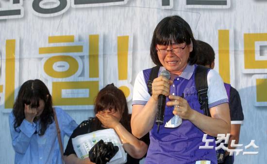21일 오후 서울 종로구 청계광장에서 세월호 참사 국민대책회의 주최로 열린 '세월호 참사 철저한 진상조사를 촉구하는 한 장의 힘! 시민대회'에서 유가족들이 진상규명 특별법 제정을 촉구하는 시민들의 서명을 건네받은 후 지속적인 관심에 대해 감사의 인사를 전하고 있다.