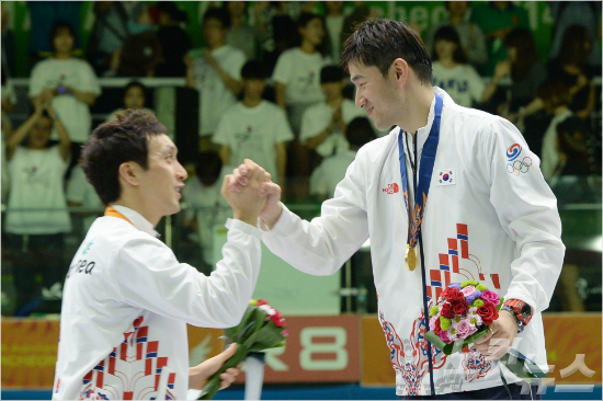 '다 네 덕분이다' 정진선(오른쪽)이 20일 인천아시안게임 펜싱 남자 에페에서 금메달을 따내고 시상대에 오른 뒤 결승에서 만난 박경두와 힘찬 악수를 나누고 있다.(고양=박종민 기자)