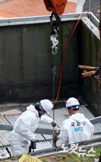 21일 오후 경기도 판교 테크노밸리 환풍구 추락사고 현장에서 경기지방경찰청 수사본부와 국립과학수사연구원이 철재 덮개와 이를 지지하는 받침대에 대한 하중 실험 등의 현장 합동 감식을 실시하고 있다.