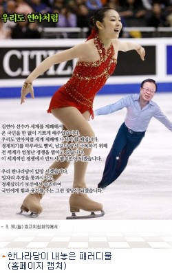 30일 한나라당 공식 홈페이지 '박희태의 말말말'에는 김연아 선수 옆으로 박희태 대표가 스케이트를 타고 있는 합성사진이 올라왔다.