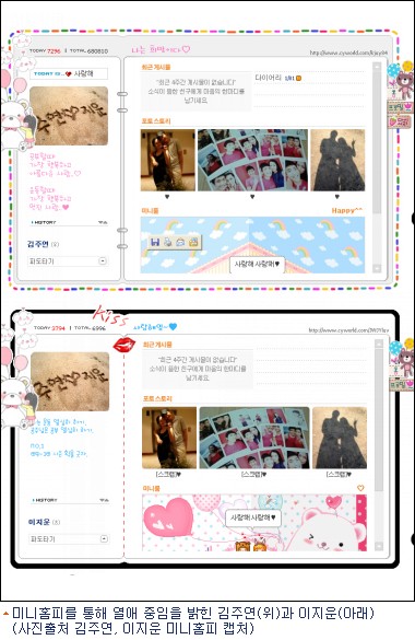 특히 두 사람은 자신의 미니홈피 메인 사진란에 '주연♡지운'이라는 글씨가 모레 위에 새겨진 사진을 똑같이 개제했다.