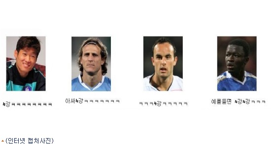 [BestNocut_R]네티즌들은 느낌이 사뭇 다른 두 대진표를 보며 "한국, 우루과이, 미국, 가나 모두 4강 진출을 확신하고 있을 것"이라며 즐거워하고 있다. 한 네티즌은 각 나라의 대표선수 격인 박지성(한국), 디에고 포를란(우루과이), 랜던 도노번(미국), 설리 문타리(가나)가 서로 "4강이다 ㅋㅋ"라며 즐거워하는 합성사진을 만들어 축구팬들을 폭소에 빠뜨렸다.