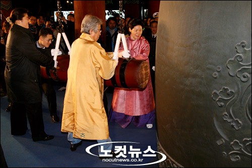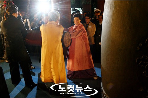 [BestNocut_R]25일 새벽 0시를 기해 서울 종로 보신각에서 이명박 대통령 당선인의 17대 대통령 임기의 공식 시작을 알리는 타종행사가 열린 가운데 (오른쪽부터) 이경숙 대통령직 인수위원장, 박범훈 취임준비위원장, ''서문시장 아줌마''로 알려진 박종분씨, 역도선수 장미란이 타종을 하고 있다.