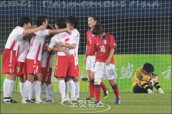 20일 오후 중국 광저우 톈허 스타디움에서 열린 2010 광저우 아시안게임 여자축구 준결승 연장 종료 직전 북한의 라은심이 추가골을 성공시키고 동료들과 환호하는 뒤로 꾸준한 선방을 펼쳤던 한국의 골키퍼 전민경이 주저앉아 있다. 한국은 북한에 1-3으로 패해 결승 진출이 좌절됐다.