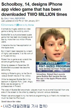 미국 유타주 스패니시 포크 지역에 살고 있는 로버트 네이(14)는 또래 아이들이 게임을 즐기는 동안 직접 게임을 만들어 앱스토어(어플 상점)에서 200만건이 넘는 다운로드를 이끌어냈다.