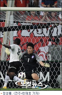 그야말로 정성룡의 선방이 눈부셨다. 가나의 빠른 공격수들에 포백라인이 고전했지만 정성룡의 선방 덕분에 승리를 챙길 수 있었다. 전반 18분 문타리의 기습 중거리슛을 쳐냈고 전반 38분에는 바두가 박스 안으로 돌파하자 과감히 뛰쳐나와 가나의 찬스를 무산시켰다.