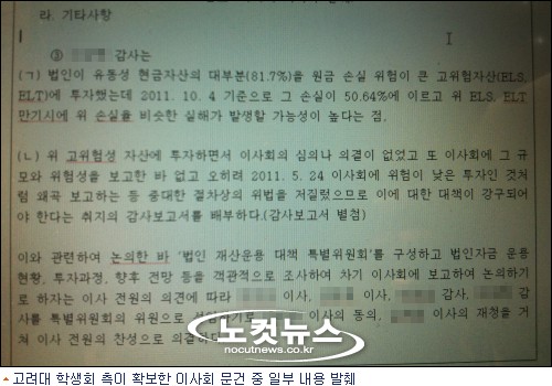 고려대 총학생회는 고려중앙학원재단이 고 위험성 자산에 투자를 했다가 손실을 입었다고 기록된 이사회 회의록을 확보했다고 밝혔다.