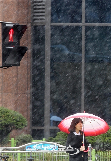 일부 지역에 대설주의보와 강풍경고가 내려진 3일 오전 강한 바람과 함께 진눈깨비가 내리는 서울 종각역 인근에서 한 시민이 신호를 기다리고 있다.