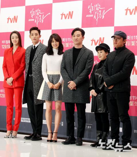 연출진이 19일 오후 서울 영등포구 영등포동 타임스퀘어 아모리스홀에서 열린 tvN 새 월화드라마 ‘일리 있는 사랑’ 제작발표회에서 파이팅 포즈를 취하고 있다. 왼쪽부터 최여진, 이수혁, 이시영, 엄태웅, 작가 김도우, 연출 한지승.