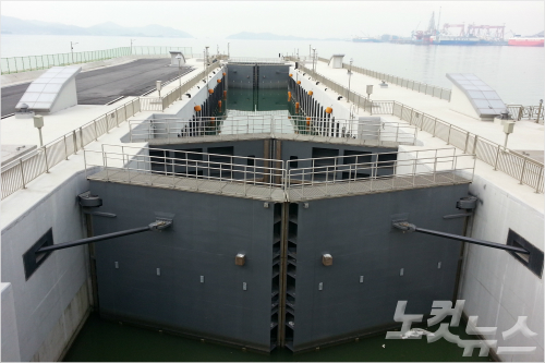 굳게 닫혀있는 영암호 통선문. 한국농어촌공사가 493억원을 들여 설치한 이 통선문을 이용해 앞으로도 배가 통행할 계획이 없어'무용지물'이 될 가능성이 높다.