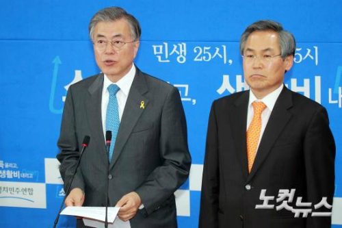 새정치민주연합 문재인 대표(좌측)가 30일 오전 국회 원내대표실에서 열리는 정책조정회의에 앞서 4.29재보선 결과와 관련 입장발표을 하고 있다. (사진=윤창원 기자)