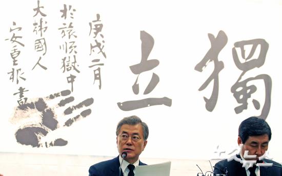새정치민주연합 문재인 대표가 26일 서울 용산구 백범김구기념관에서 열린 최고위원회의에서 모두발언을 하고 있다. 새정치민주연합은 역사 교과서 국정화 반대 행보의 일환으로 항일 독립 운동의 의미와 임시 정부의 정통성을 일깨운다는 취지로 백범기념관에서 최고위 회의를 가졌다.