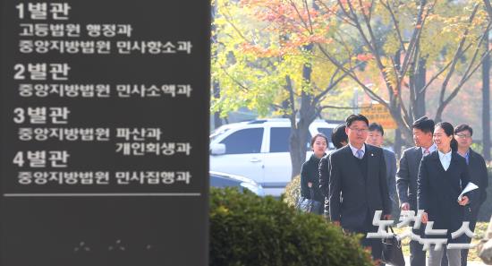 새정치민주연합 권은희 의원이 5일 서울 서초구 중앙지방법원에서 열린 '모해위증'에 대한 첫 재판에 참석하고 있다. 권 의원은 김용판 전 서울지방경찰청장의 공직선거법 위반 등의 재판 과정에서 위증을 한 혐의(모해위증죄)로 불구속 기소됐다.