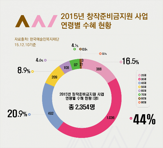 특히, 2~30대 젊은 예술인이 총 1,424명으로 전체 비중의 약 60.5%를 차지해 '창작준비금지원' 사업이 '열정페이'와 결부되어 일자리 창출에 큰 어려움을 겪고 있는 청년예술인들에게도 실질적인 도움을 주고 있는 것으로 나타났다.