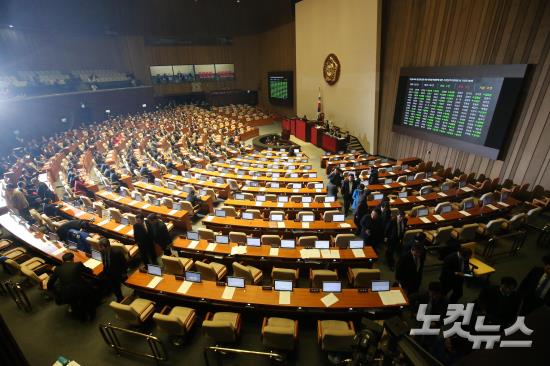 2일 오후 서울 여의도 국회에서 열린 340회 국회(임시회) 7차 본회의에서 국민보호와 공공안전을 위한 테러방지법안에 대한 수정안(주호영 의원 외 156인 발의)의 표결이 시작되자 야당 의원들이 퇴장하고 있다. 이날 테러방지법은 야당이 표결에 참여하지 않은 재석 157인 중 찬성 156인, 반대 1인으로 통과됐다.