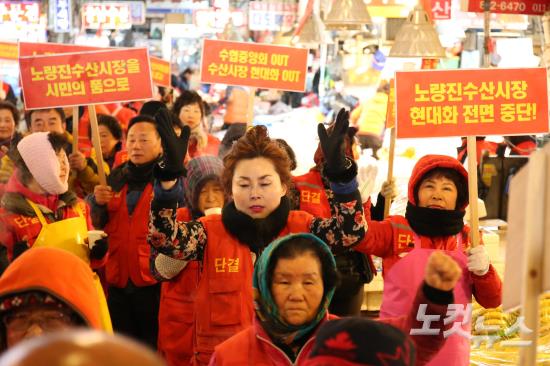 11일 오전 서울 노량진 수산시장에서 상인들이 시장 현대화 사업에 반대하는 집회를 열고 있다.