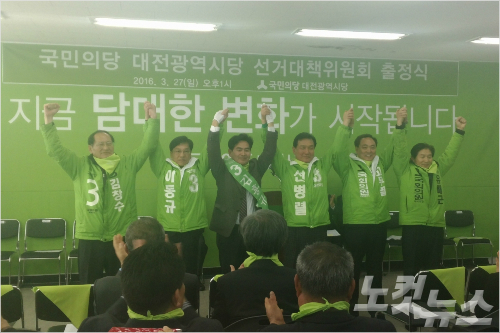 27일 국민의당 대전시당사에서 열린 선대위 출범식에서 20대 총선 후보자들이 선거 승리를 다짐하고 있다. (사진=김정남 기자)