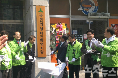27일 국민의당 대전시당사 앞에서 당 관계자들이 현판식을 갖고 있다. (사진=김정남 기자)