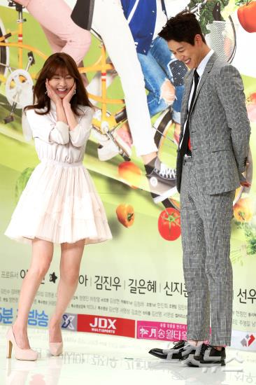 배우 신지훈(오른쪽)과 길은혜가 28일 오후 서울 영등포 타임스퀘어 아모리스홀에서 열린 KBS 1TV 일일저녁극 '별난 가족' 제작발표회에서 포즈를 취하고 있다.