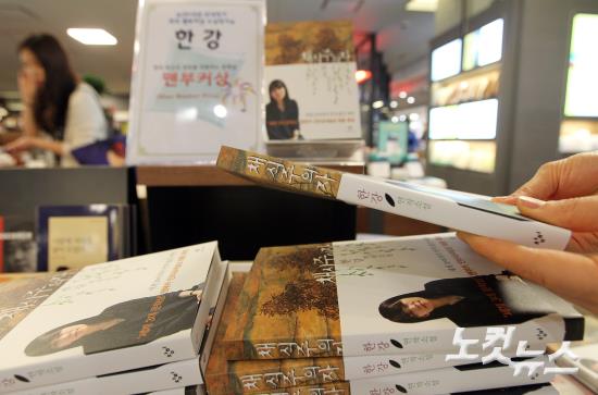17일 오전 서울 광화문 교보문고에서 관계자가 한국인 최초로 세계적 권위의 맨부커상을 받은 소설가 한강의 소설 ‘채식주의자’ 를 정리하고 있다. 영미권 최고 권위를 자랑하는 맨부커상은 노벨문학상, 프랑스 콩쿠르상과 함께 세계 3대 문학상으로 꼽히고 있다.