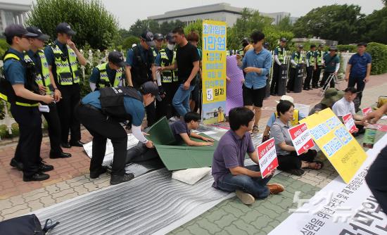 구교현 노동당 대표와 박정훈 알바노조 위원장 등이 20일 오전 서울 여의도 국회 앞에서 최저임금 1만원 실현을 위한 국회 및 제 정당들의 응답을 촉구하며 단식 농성을 하던 중 농성 위치를 문제 삼은 경찰과 실갱이를 벌이고 있다.
