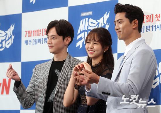배우 권율(왼쪽부터), 김소현, 옥택연이 1일 오후 서울 논현동 임피리얼팰리스 호텔에서 열린 tvN 새 월화드라마 ‘싸우자 귀신아’ 제작발표회에 참석해 포즈를 취하고 있다.