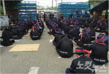 정문 앞에서 집회를 하고 있는 갑을오토텍 노동조합 조합원들(사진=김미성 기자)