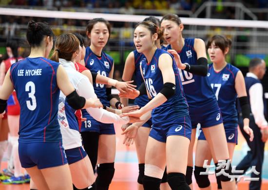 여자배구 대표팀 선수들이 8일 저녁(현지시간) 브라질 리우데자네이루 마라카낭지뉴 경기장에서 열린 여자배구 조별리그 2차전 러시아와의 경기에서 패한 후 동료들을 격려하고 있다. 한국 여자배구 대표팀은 러시아에 세트스코어 1대3으로 패해 1승 1패를 마크했다.