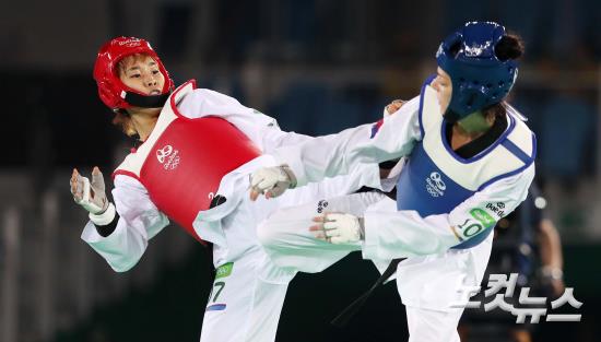 태권도 한국 대표 김소희가 17일 오전(현지시간) 브라질 리우데자네이루 바하 올림픽파크 카리오카 경기장3에서 열린 2016리우데자네이루 올림픽 태권도 여자 -49kg급 결승에서 세르비아의 티아나 보그다노비치와 대결하고 있다. 김소희는 경기에서 승리해 금메달을 획득했다.