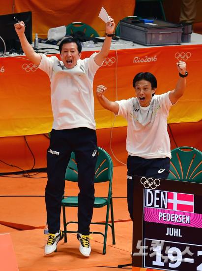일본 배드민턴 대표팀을 이끄는 박주봉 감독(왼쪽)이 18일(현지시간) 브라질 리우데자네이루 리우센트로 파빌리온4 경기장에서 열린 2016 리우올림픽 배드민턴 여자 복식 결승전에서 일본에 마쓰토모 미사키-다카하시 아야카가 덴마크에 크리스티나 페데르센-카밀라 리터 율을 상대로 금메달을 확정짓자 환호하고 있다. 박 감독은 일본 여자 배드민턴 대표팀을 세계 최정상 수준으로 끌어올렸다는 평가를 받고 있다.