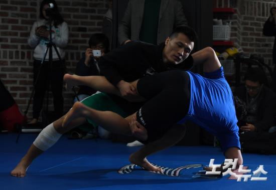 UFC 파이터 정찬성이 4일 오후 서울 서초구 역삼동 코리안 좀비 종합격투기 체육관에서 공개훈련을 하고 있다