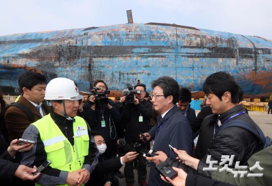 유승민 바른정당 대선후보가 1일 목포신항을 방문해 류찬열 샐비지코리아 회장으로부터 세월호에 대한 설명을 듣고 있다.