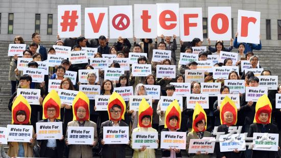 4일 오후 서울 세종로 세종문화회관 앞에서 열린 ‘2017 대선주권자행동 발족 기자회견’ 참석자들이 손피켓을 들어보이고 있다.