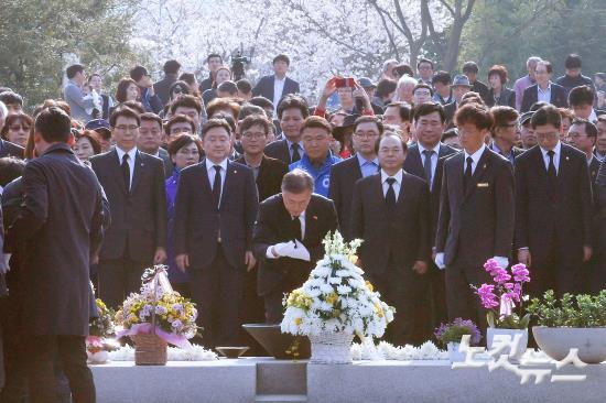 더불어민주당 문재인 대선후보가 4일 오전 경남 봉하마을 고 노무현 전 대통령 묘역을 참배하고 있다.