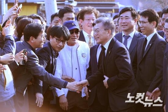고 노무현 전 대통령 묘역 찾은 시민들과 인사하는 문재인 더불어민주당 대선후보