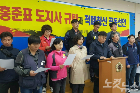 이들은 "박근혜 전 대통령이 대한민국을 위태롭게 했다면 홍 지사는 도민을 힘들고 고통스럽게 했다"며 "불법 정치자금 수수 혐의로 대법원에 재판이 계류되어 있는데도 정당의 대선 후보가 됐다"고 지적했다.