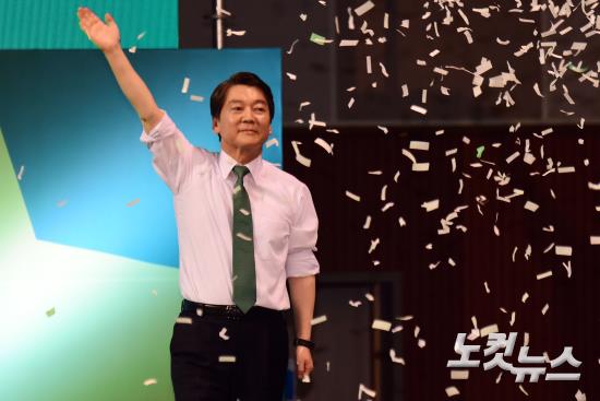 4일 오후 대전 한밭체육관에서 열린 국민의당 제19대 대통령선거후보자 선출대회에서 대선후보로 선출된 안철수 후보가 손을 들어보이고 있다.
