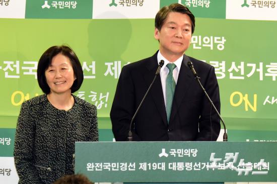 4일 오후 대전 한밭체육관에서 열린 국민의당 제19대 대통령선거후보자 선출대회에서 안철수 후보가 대선후보로 확정된 뒤 부인 김미경 교수와 함께 기자회견에 참석하고 있다.