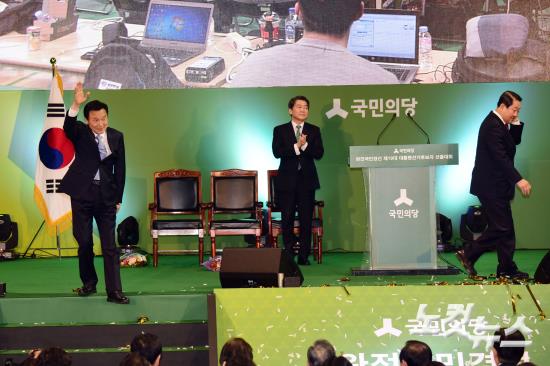 4일 오후 대전 한밭체육관에서 열린 국민의당 제19대 대통령선거후보자 선출대회에서 안철수 후보가 대선후보로 확정된 뒤 손학규 후보와 박주선 후보가 무대 아래로 내려가고 있다.