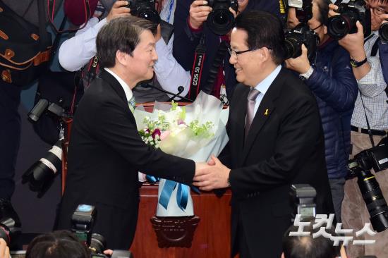 국민의당 박지원 대표가 5일 오전 국회에서 열린 당 최고위원·국회의원 연석회의에서 안철수 대선후보에게 꽃다발을 전달하고 있다.